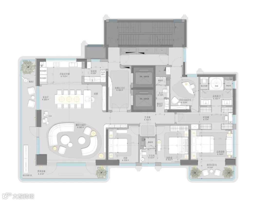 让空间再大一点,让自由再多一些。约100㎡开放场域,让居者的会晤、酒会、家人的宴会,都有了安放的格局。
