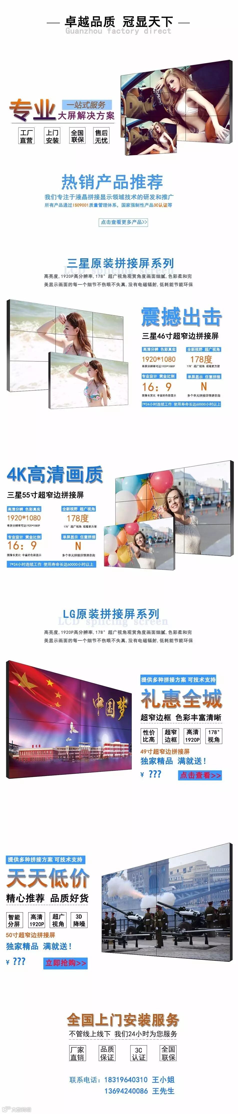 随着大屏幕显示行业日新月异的技术发展,冠显科技与三星、LG、夏普、AU、奇美等韩台巨头紧密合作,在新型平板拼接显示技术研发上一直保持领先优势,不断在市场上投放最新和最具性价比的产品,广泛应用于政府、电力、能源、石油石化、军队、人防、公检法、交通、通信、企事业单位、酒吧、酒店、KTV等各行各业,满足客户安防监控调度、应急指挥、展览展示、教育培训、会议等各方面的需求。