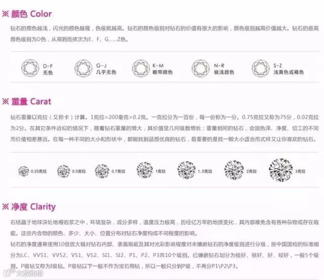 英文中克拉重量(Carat Weight)、净度(Clarity)、颜色(Colour)、切磨(Cut)都由字母"C"开头 ,所以简称4C。4C分级就是从钻石的克拉重量、净度、颜色和切工进行优劣美丑贵贱的评定。下面头条君就和大家来介绍4C分级的具体内容: