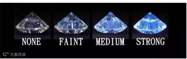 荧光(fluorescence)强度级别划分为"强"、"中"、"弱"、"无"四个等级。荧光级分别为中或强级,可以使接近无色的钻石表面在一定的距离上看起来更加白,从而给钻石增加了一层朦胧之感或者油滑之感。具有中级或强级荧光的钻石价位要比其他钻石价格低。