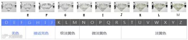 目前国内商场和网上多半销售的是F-J色之间的钻石,D、E这样高色的钻石少见,K以后的黄色钻石也少见有售。