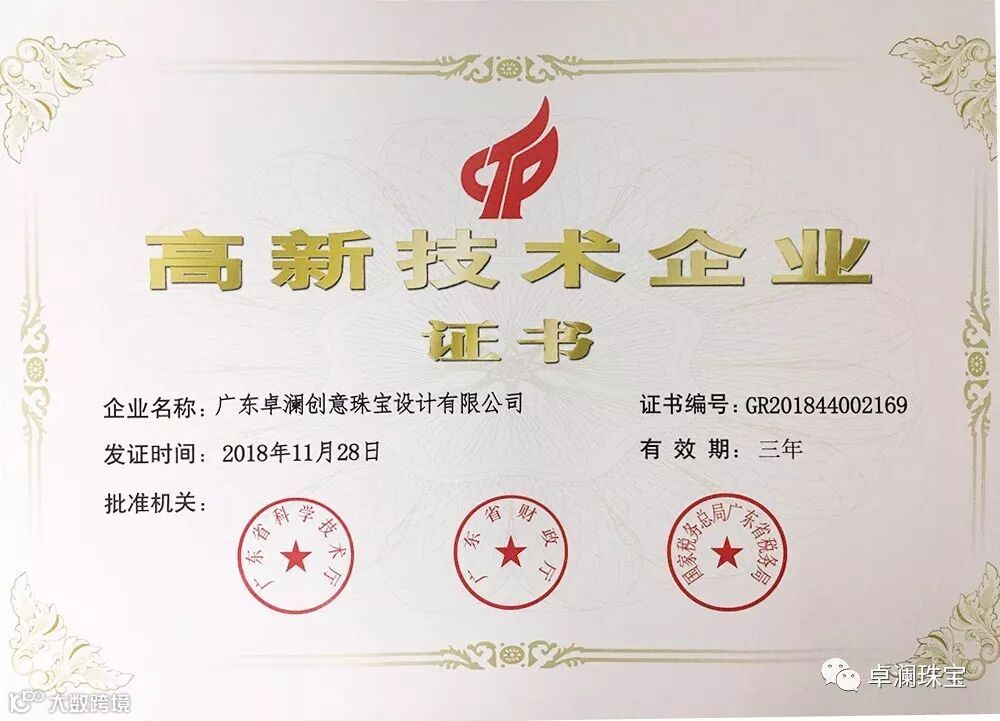 近日,经广东省科学技术厅、广东省财政厅、国家税务总局广东省税务局的层层筛选和严格审核,卓澜创意珠宝设计有限公司被认定为国家高新技术企业。这一荣誉的获得,更加推动了公司自主创新、自主研发的进程,成为公司发展史上的又一个里程碑。