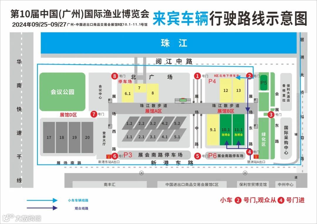 ·乘坐地铁:广州东站坐地铁3号线北延段(体育西方向),坐2个站到体育西站,转地铁3号线(番禺广场方向),坐3个站到客村站,转地铁8号线(万胜围方向),到琶洲站A出口出站,从4号门进入展馆。