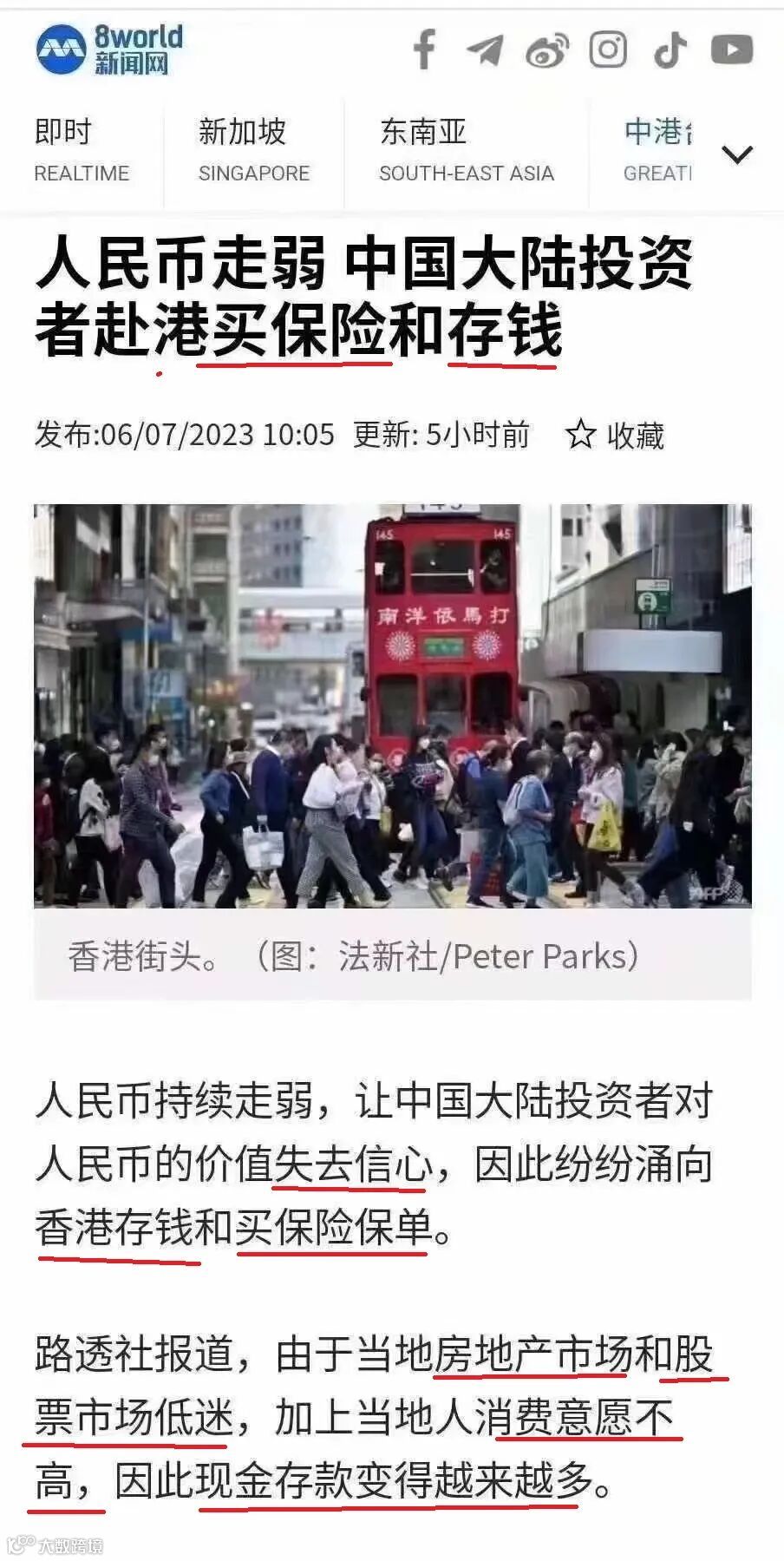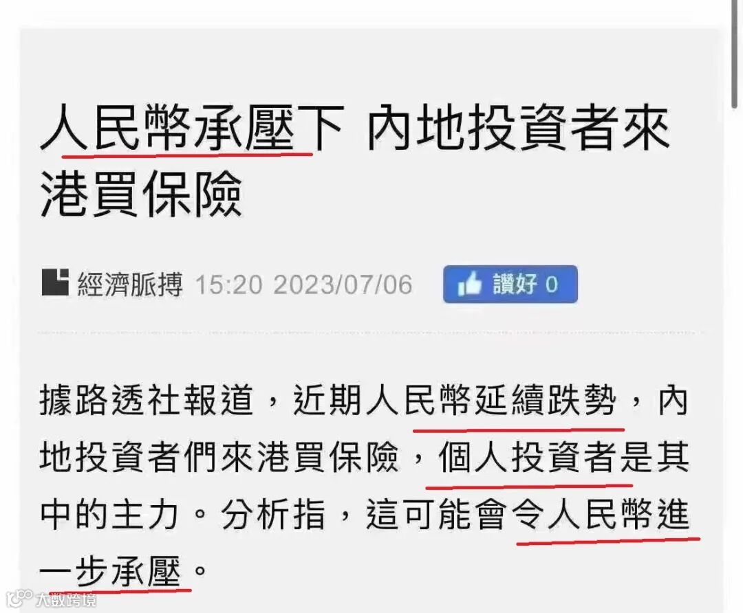 导读:人民币持续走弱,大陆投资者纷纷涌向香港存钱和买保险保单。