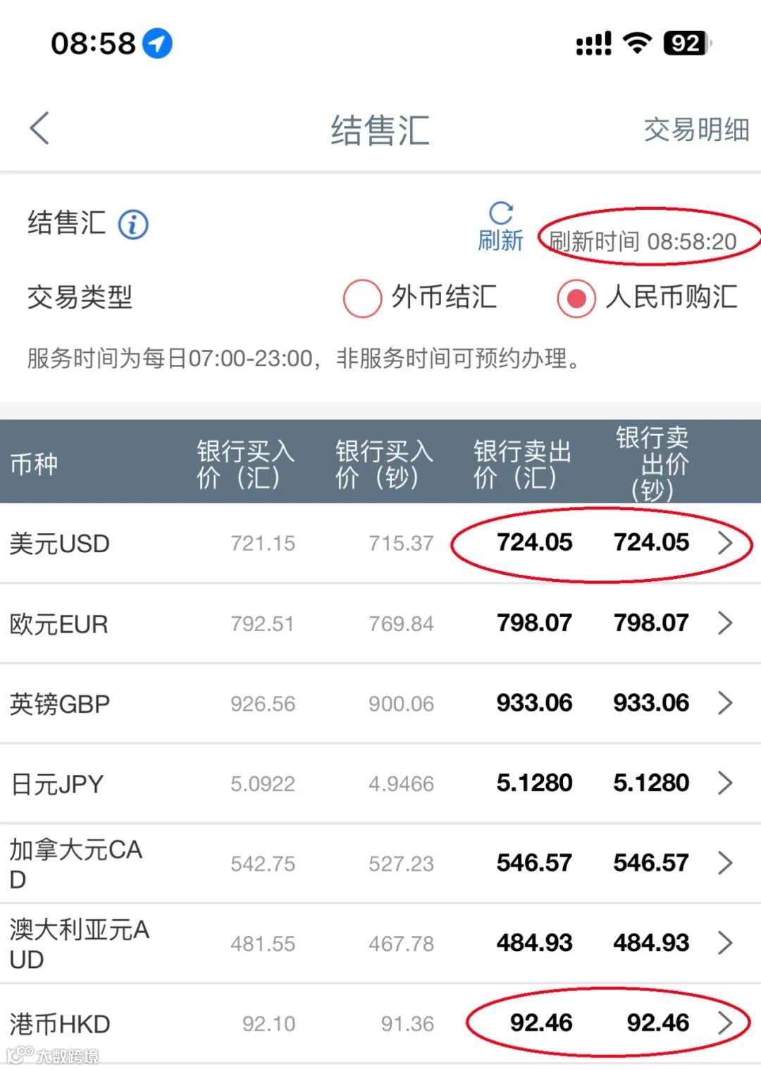 今日的人民币美元走势,