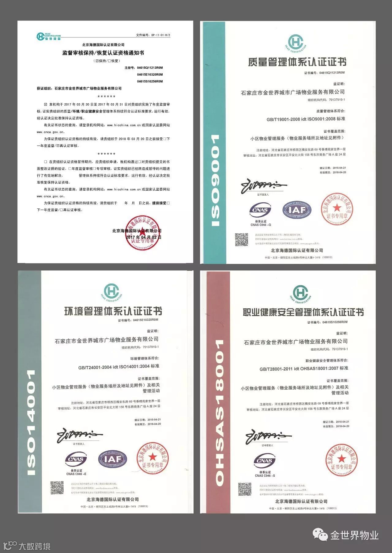 近日,海德认证集团审核组专家们一行对金世界物业公司管理体系覆盖的紫御府项目部进行了ISO9001质量管理体系、ISO14001环境管理体系、OHSAS18001职业健康安全管理体系复审,专家组一致认定管理体系运行有效,通过复审。金世界物业于4月2日正式获得质量、环境、职业健康安全 “三标一体化”管理复审系统认证证书。