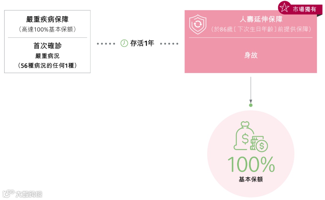 3、市场独有的人寿延伸保障,重疾赔偿后,仍提供身故保障