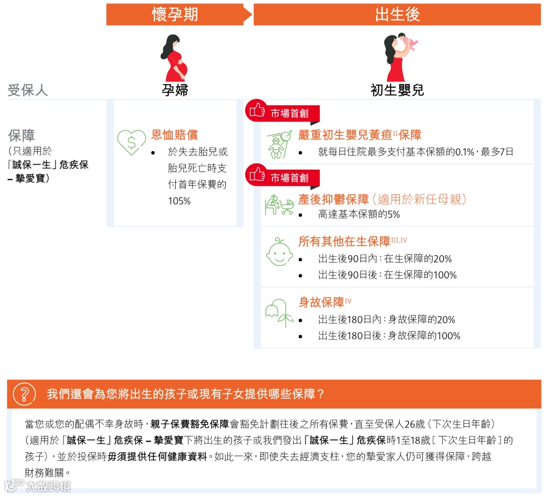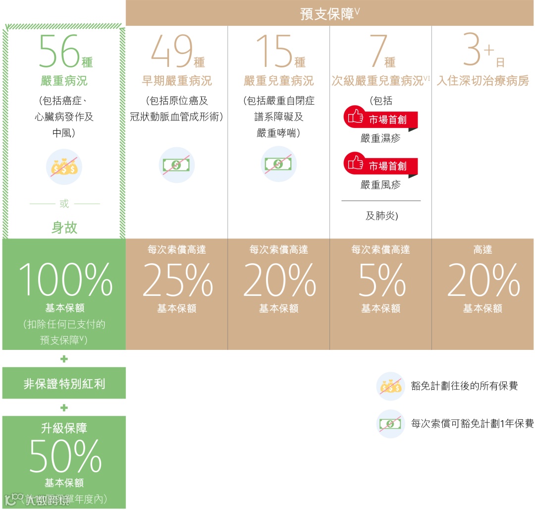 以往,香港重疾险的重疾和人寿通常共享保额,首次重疾理赔后,身故保障就终止了。而「诚保一生」赔偿完100%重疾保额后,继续提供100%人寿保障。