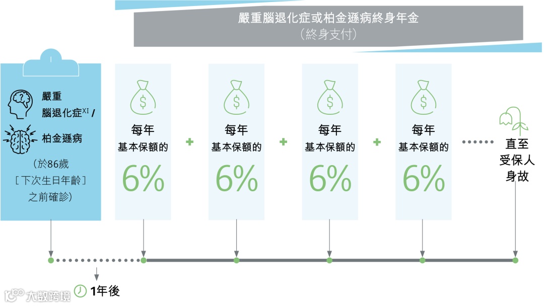 为严重脑退化症或柏金逊病提供终身年金保障,确诊1年后,每年赔偿6%保额直至终身。之前市面上有严重脑退化终身年金,保诚这次加入了柏金逊病,顺应长寿时代的需求,进一步缓解失能人士的终身护理重担。