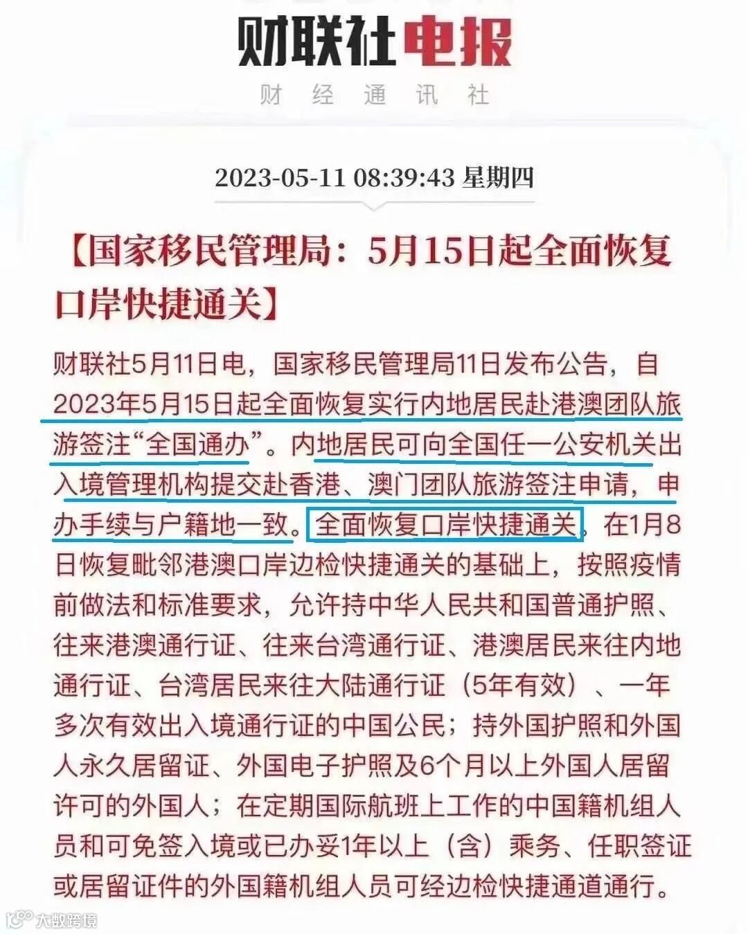 中国国家移民管理局11日发布消息,为进一步保障便利中外出入境人员往来,促进服务对外开放,国家移民管理局自2023年5月15日起进一步调整优化以下出入境管理政策措施,全面恢复口岸快捷通关。包括全面恢复实行内地居民赴港澳团队旅游签注“全国通办”,内地居民申办赴港澳地区探亲、工作、学习证件“全国通办”等。