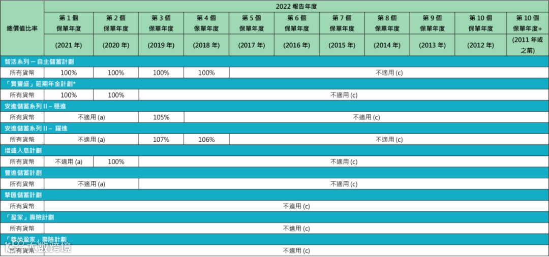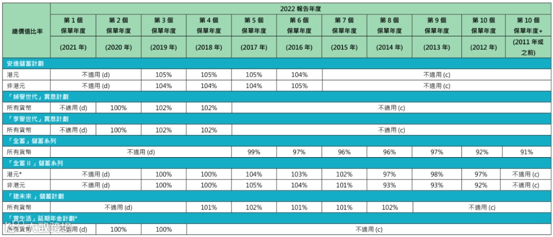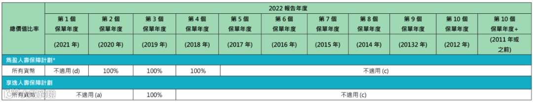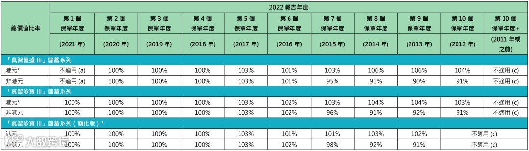 2018-2020年投保的「隽盈人寿」美元保单,2022年的总现金价值比率都为100%。