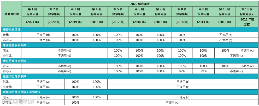2017年投保的「康诺II/康采II」,2022年的总现金价值比率都是100%。「挚爱保」2021年推出,2022还未到红利公布时间。