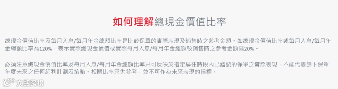 总价值比率:实际到手的现金价值和计划书上演示预期现金价值的比值,总现金价值=保证现金价值+非保证现金价值(保额增值/周年红利+终期红利)。