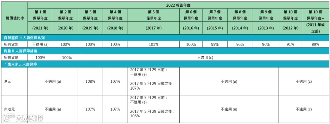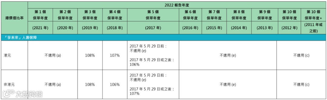 2018、2019年投保的「惠未来」美元保单,2022年的总现金价值比率都是107%。
