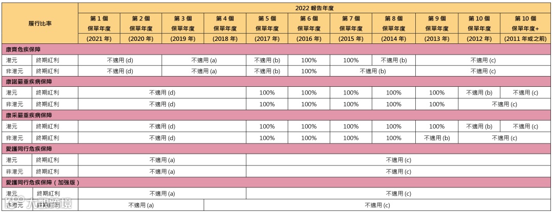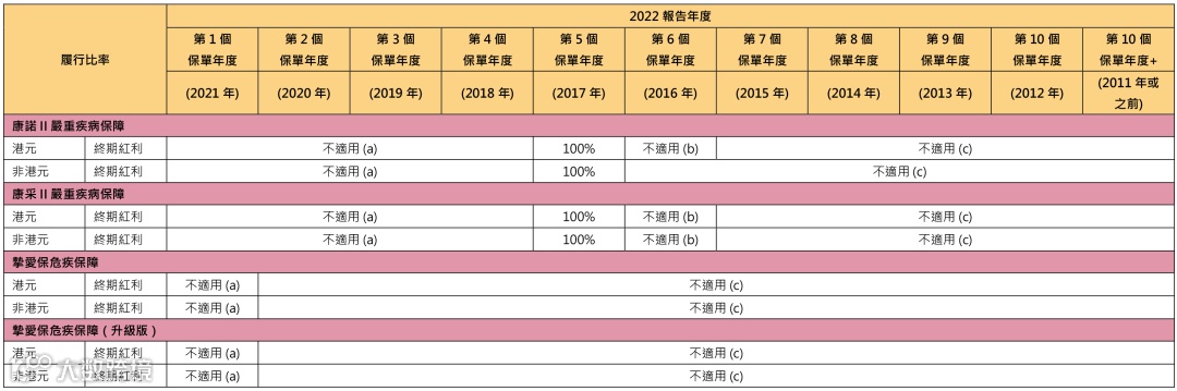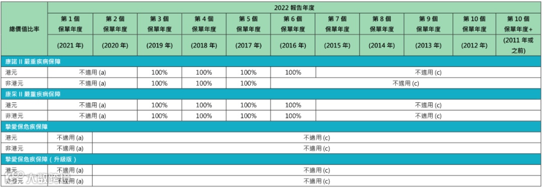 2016-2019年投保的「康诺II/康采II」,2022年的总现金价值比率都是100%。「挚爱保」2021年推出,2022还未到红利公布时间。