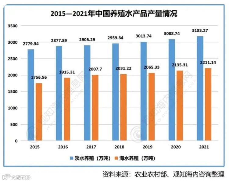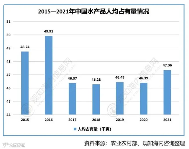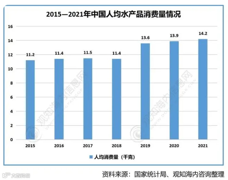 从需求端情况来看,随着近年来我国经济的不断发展,居民生活水平的提升,居民对水产品的需求量不断增加,为我国水产品行业的发展提供了强劲的动力。据资料显示,2021年我国居民人均水产品消费量为14.2千克,较上年增加0.3千克。