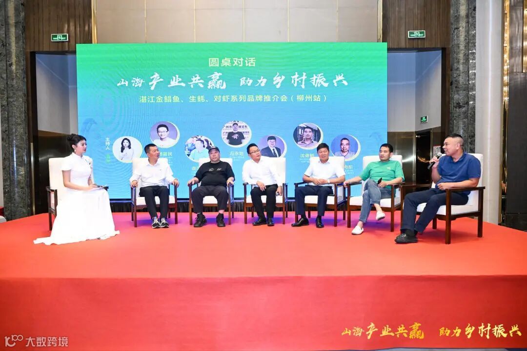 在沙龙环节,湛江市乡村振兴协会秘书长、湛江市享爱食品有限公司董事长杨富民,中国渔业协会水产商贸分会常务副秘书长袁道亮,四川省火锅协会秘书长冯永地,广东画景食品有限公司董事长刘定,柳州海吉星北部湾海产董事长沈德新,湛江汇富海洋科技有限公司董事长徐向东围绕“山海产业共赢,助力乡村振兴”就两市水产情况、市场前景、品牌建设等方面进行深入的探讨和交流。