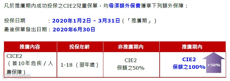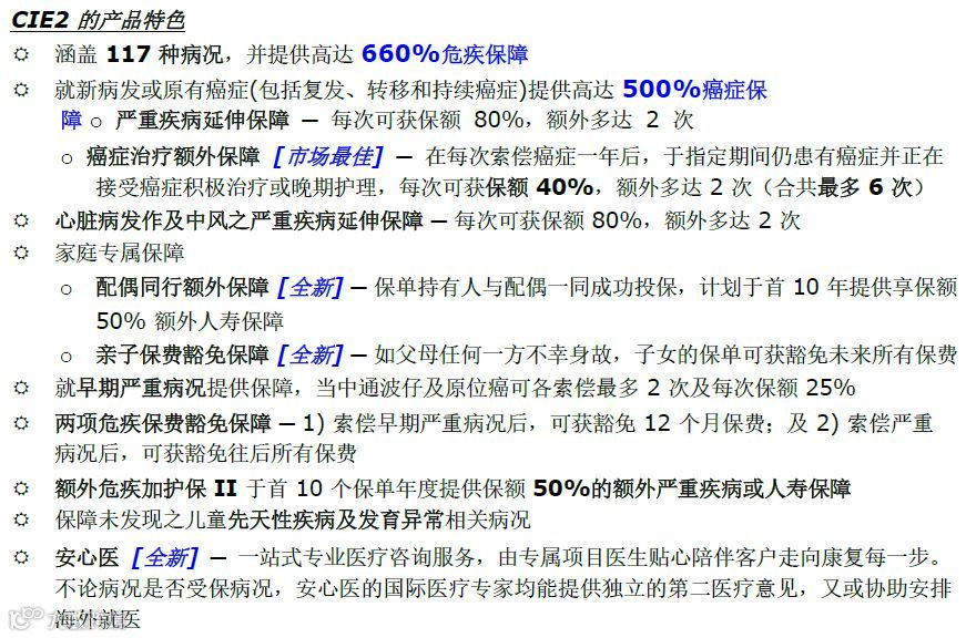 作为一项强化版的产品方案,CIE2 是一个全面的终身危疾保障计划,保障涵盖 61 项早期严重病况和 56 项严重病况。除就癌症、心脏病发作及中风三项主要危疾提供延伸保障外,CIE2 更就以下范畴进行升级,为客户提供更全面的保障: