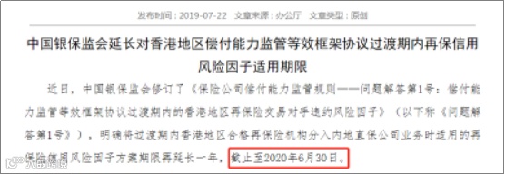 同时,今年7月份,中国银保监会修订了《保险公司偿付能力监管规则——问题解答第1号:偿付能力监管等效框架协议过渡期内的香港地区再保险交易对手违约风险因子》,通知明确将过渡期内香港地区合格再保险机构分入内地直保公司业务时适用的再保险信用风险因子方案期限再延长一年,截止至2020年6月30日。