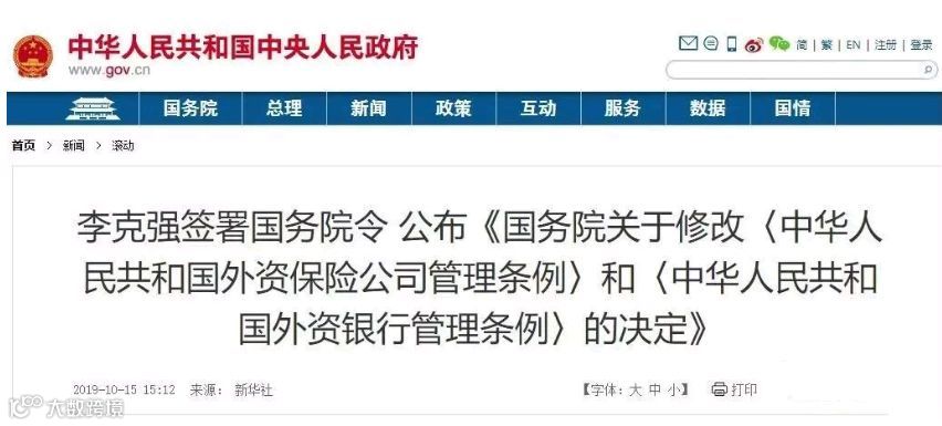 2019年10月15日,李克强总理签署国务院令,公布《国务院关于修改〈中华人民共和国外资保险公司管理条例〉。