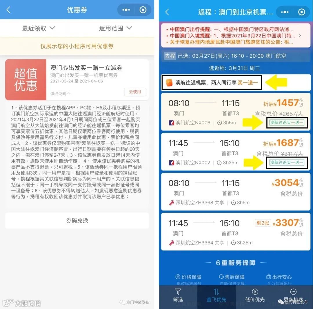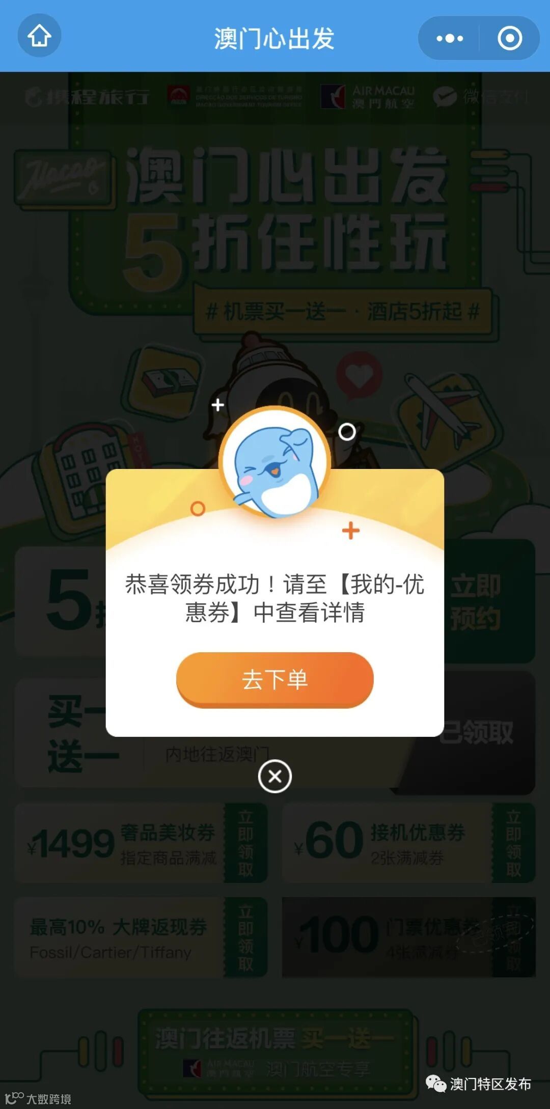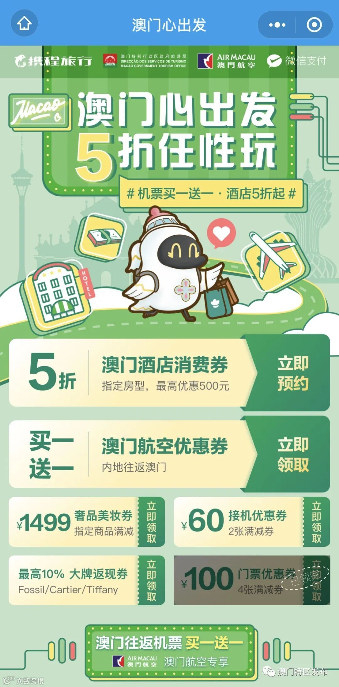 点击“酒店机票券”进入小程序,按照提示在“澳门航空优惠券”处点击“立即领取”