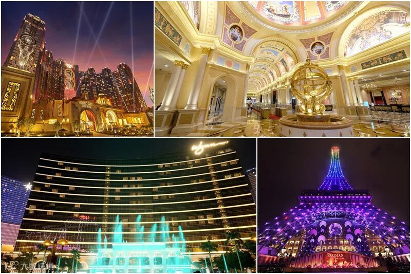 路凼城:威尼斯人 (运河游船)、巴黎人 (巴黎铁塔)、新濠天地 (水舞间)、新濠影汇 (8字摩天轮、蝙蝠侠)、银河酒店 (钻石秀、水上乐园)、永利皇宫 (水舞、缆车)、美狮美高梅 (金狮雕像)