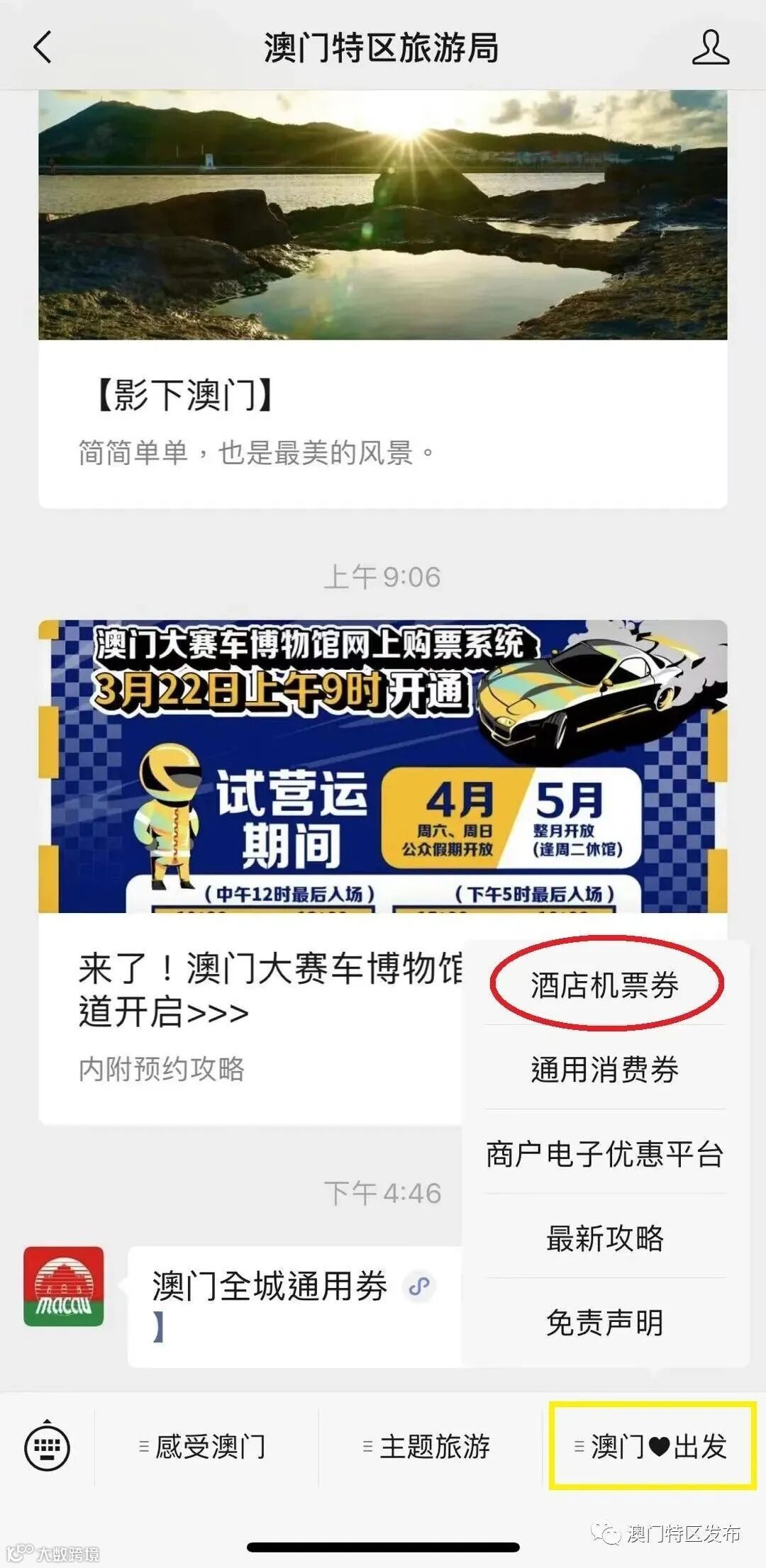 关注“澳门特区旅游局”公众号,点击右下方菜单栏里的“澳门❤出发”