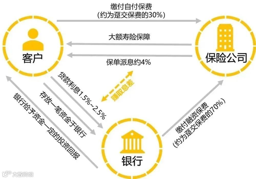 保费融资是投保人、保险公司、银行三方围绕“保险合同”展开的合作,其操作方式类似于贷款买房:投保人向保险公司缴纳一定的“首付”,再向银行贷款一定金额购买大额寿险保单,投保成功后保单将作为放贷的抵押物交由银行保管,直至贷款还清。