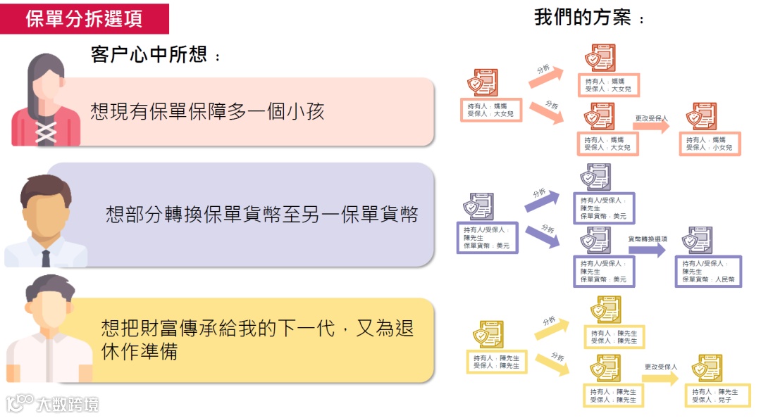 内地储蓄保单和以前的香港储蓄保单只能退保或部分退保来取出现金价值,现在的保单可拆分成多份,这样可以根据自己的需要来分配给不同的受益人而不用把保单人为退保或部分退保。避免退保带来的损失。同时还可以透过保单货币转换功能,把拆分后的保单指定为不同货币,如果家人去到世界不同国家或地区,也可以轻松应对。