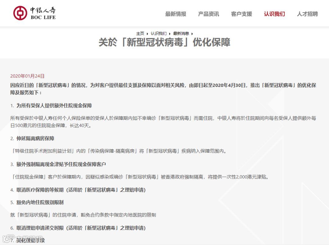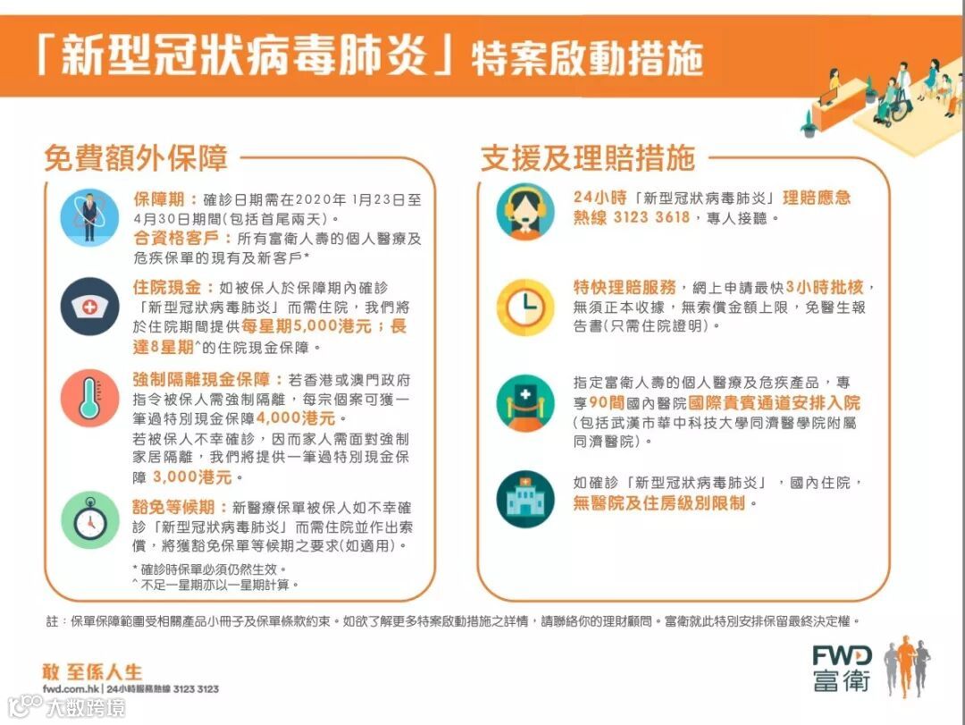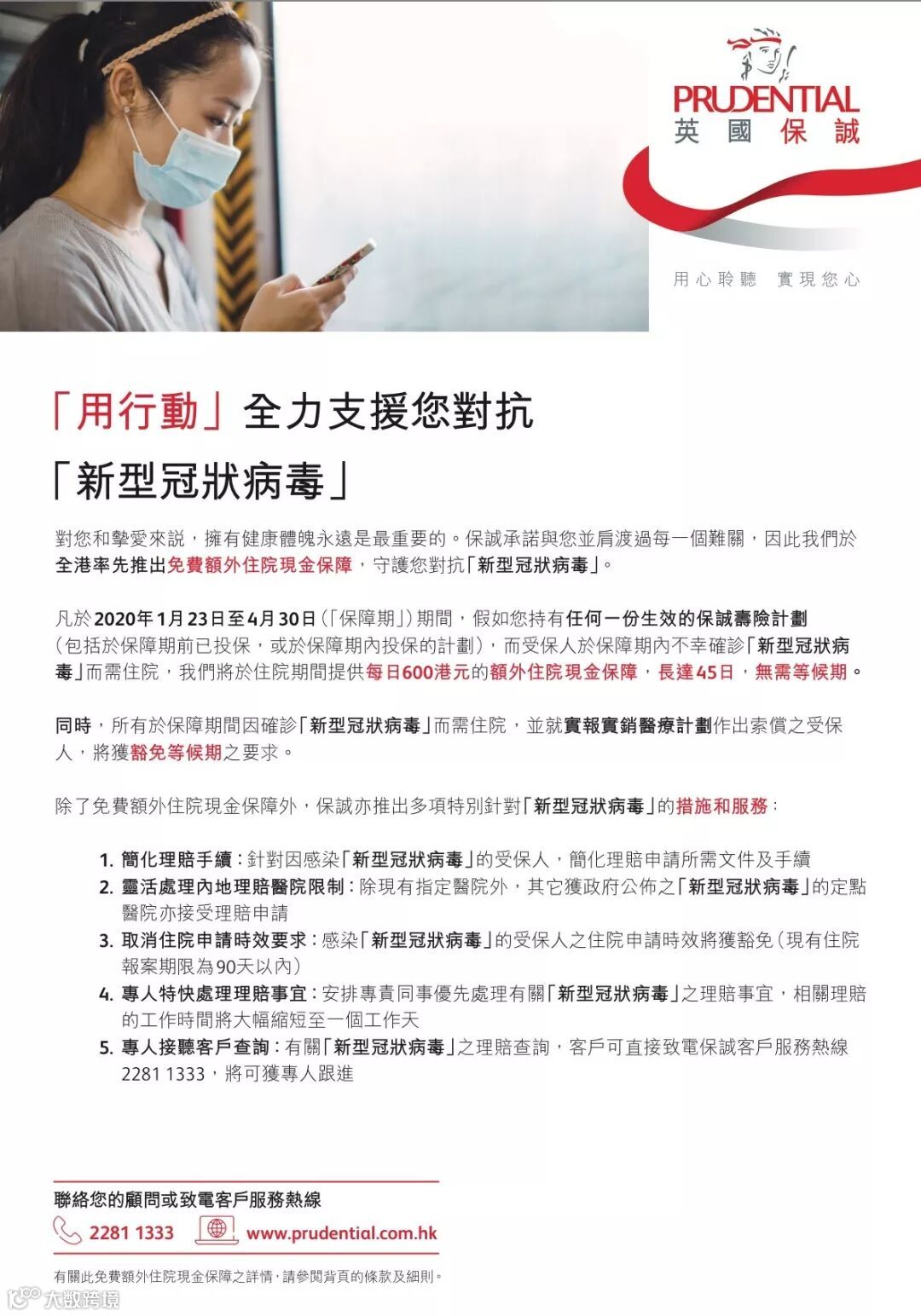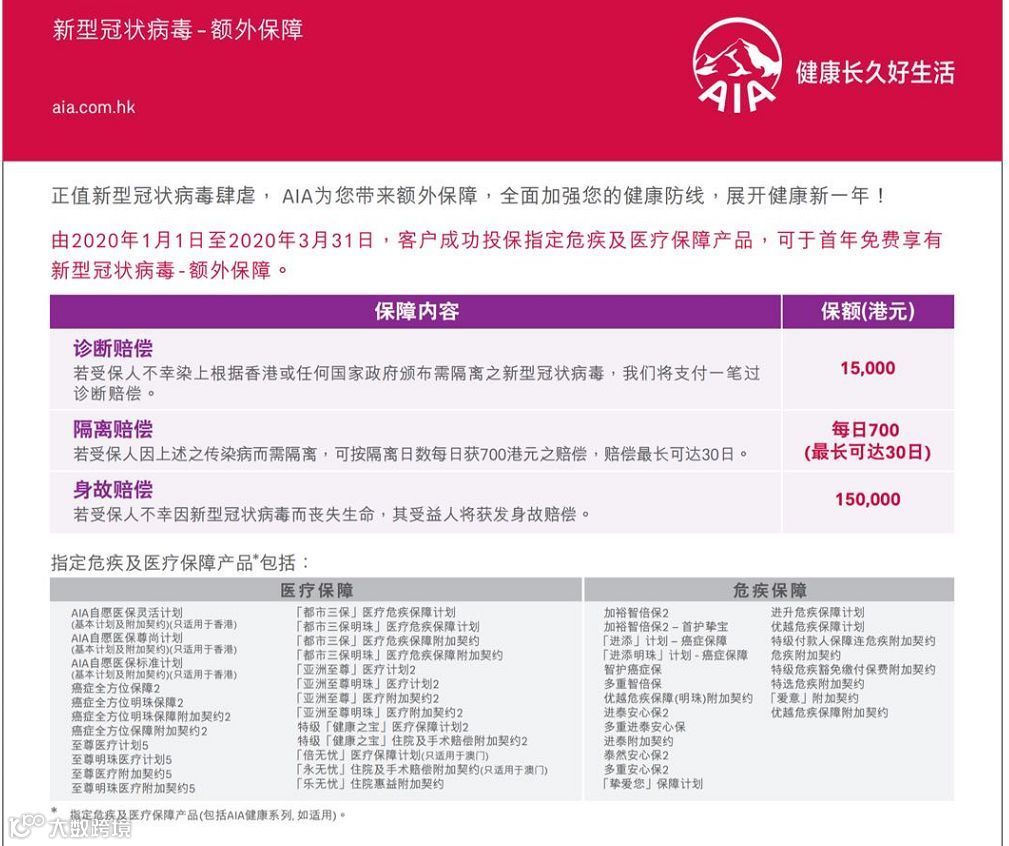 当然,除此之外友邦香港早先公布的新型冠状病毒额外保障仍然有效,包括隔离赔偿,身故赔偿等等。