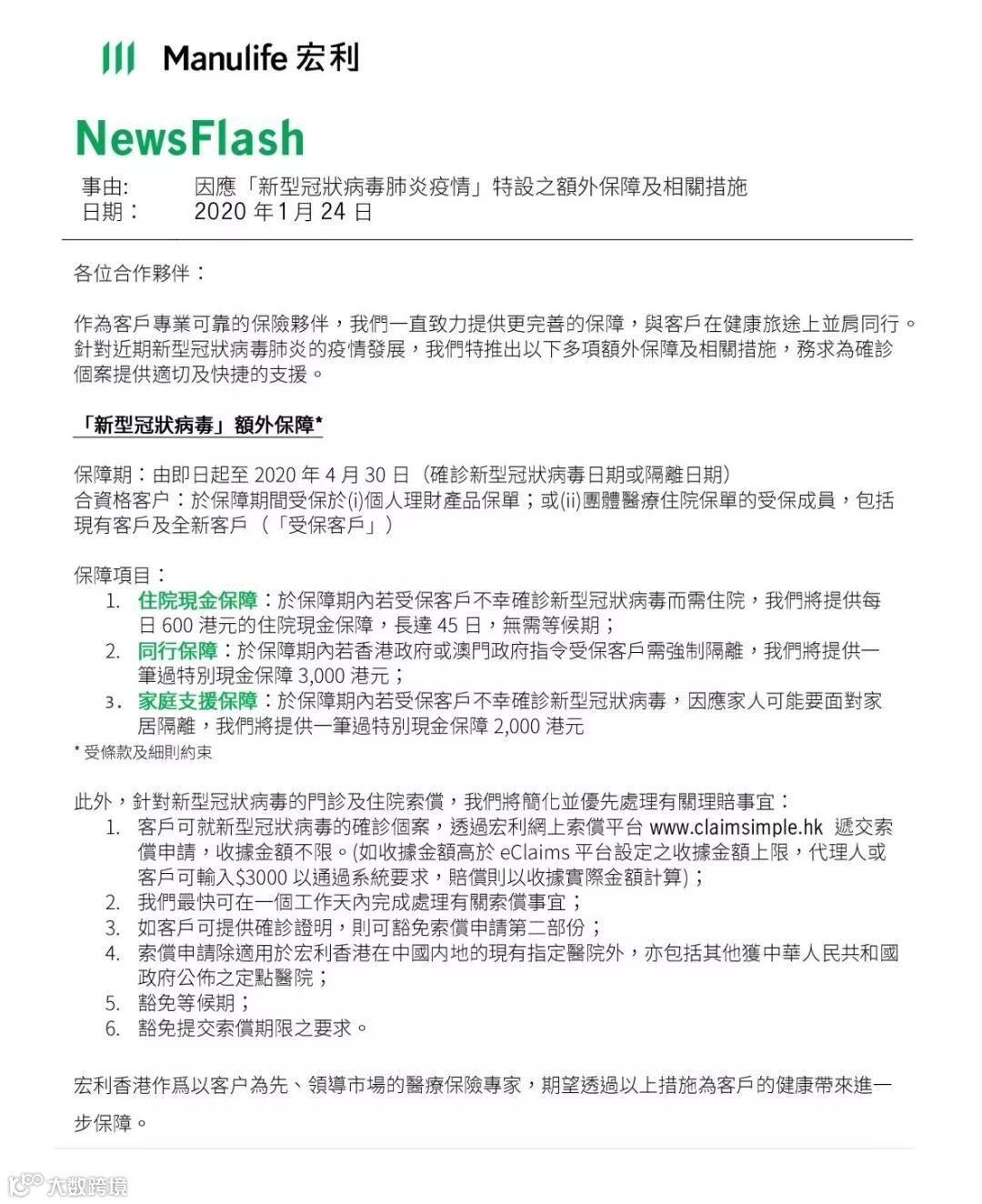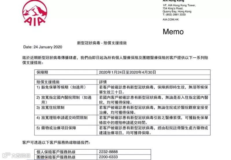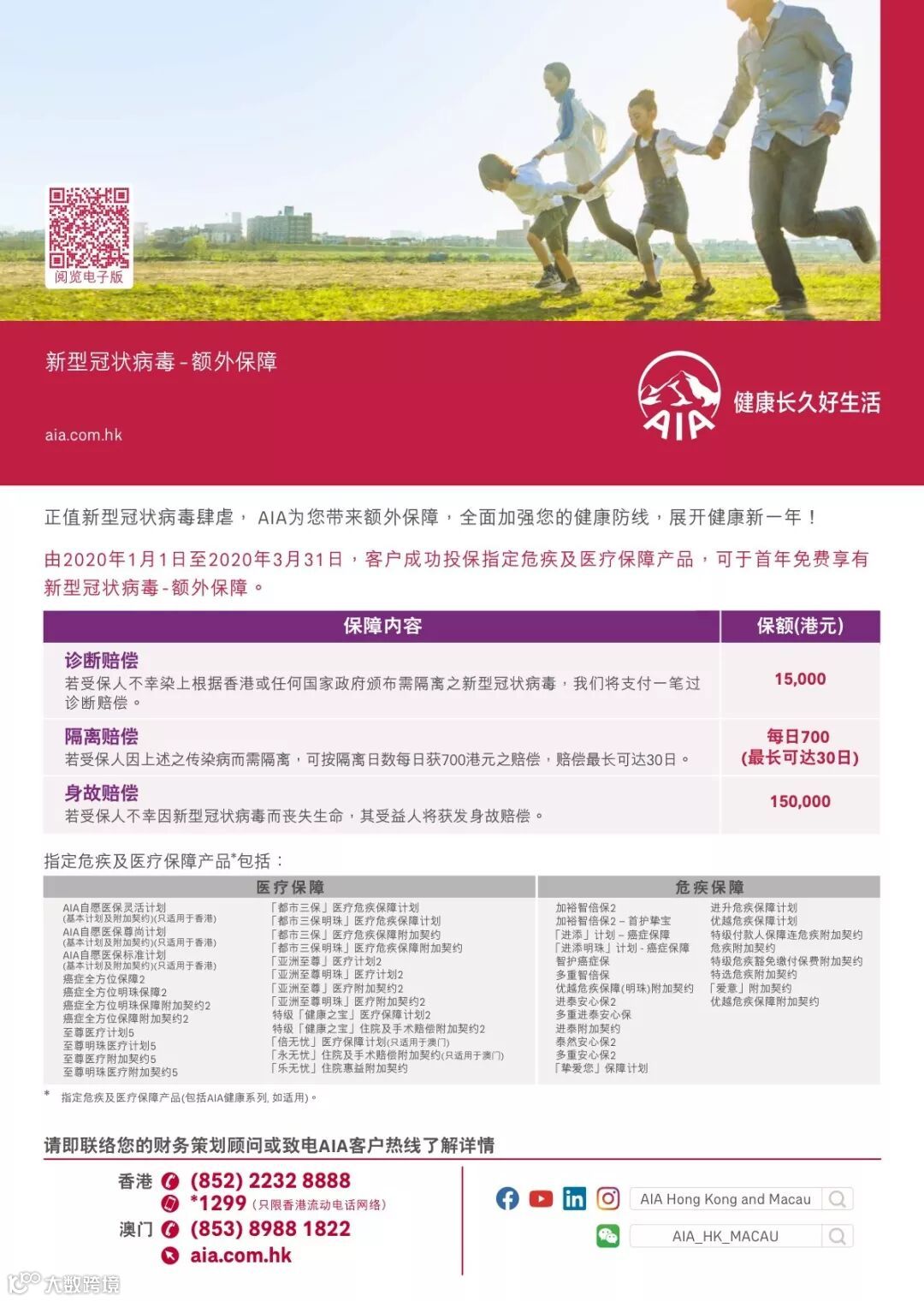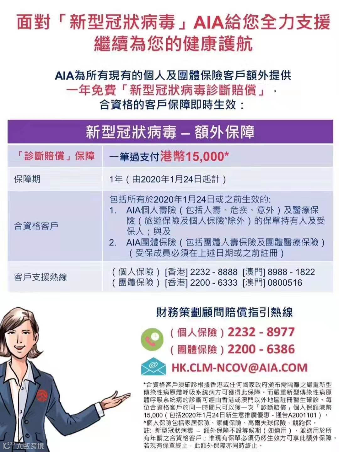 1月29日,友邦香港再次升级针对新型冠状病毒的支援服务,免费给予所有友邦个人(人寿,医疗,重疾,意外等)及团体客户额外1年免费“新型冠状病毒诊断赔偿”,也就是一旦确诊将获得友邦15000HKD赔付。