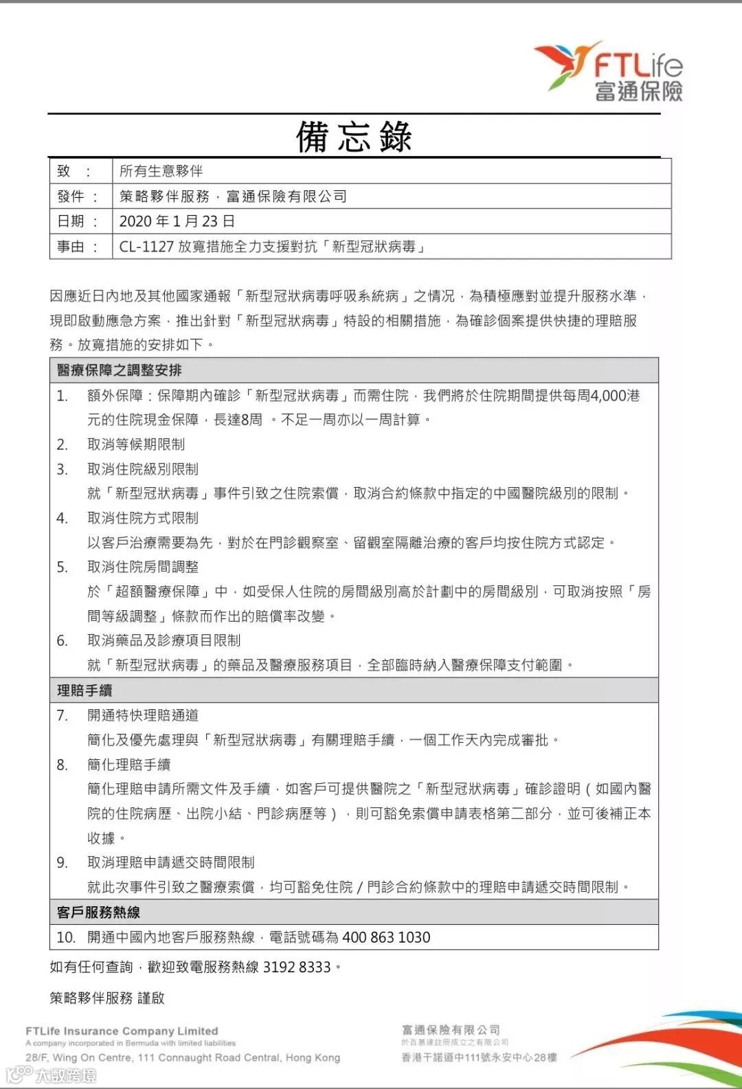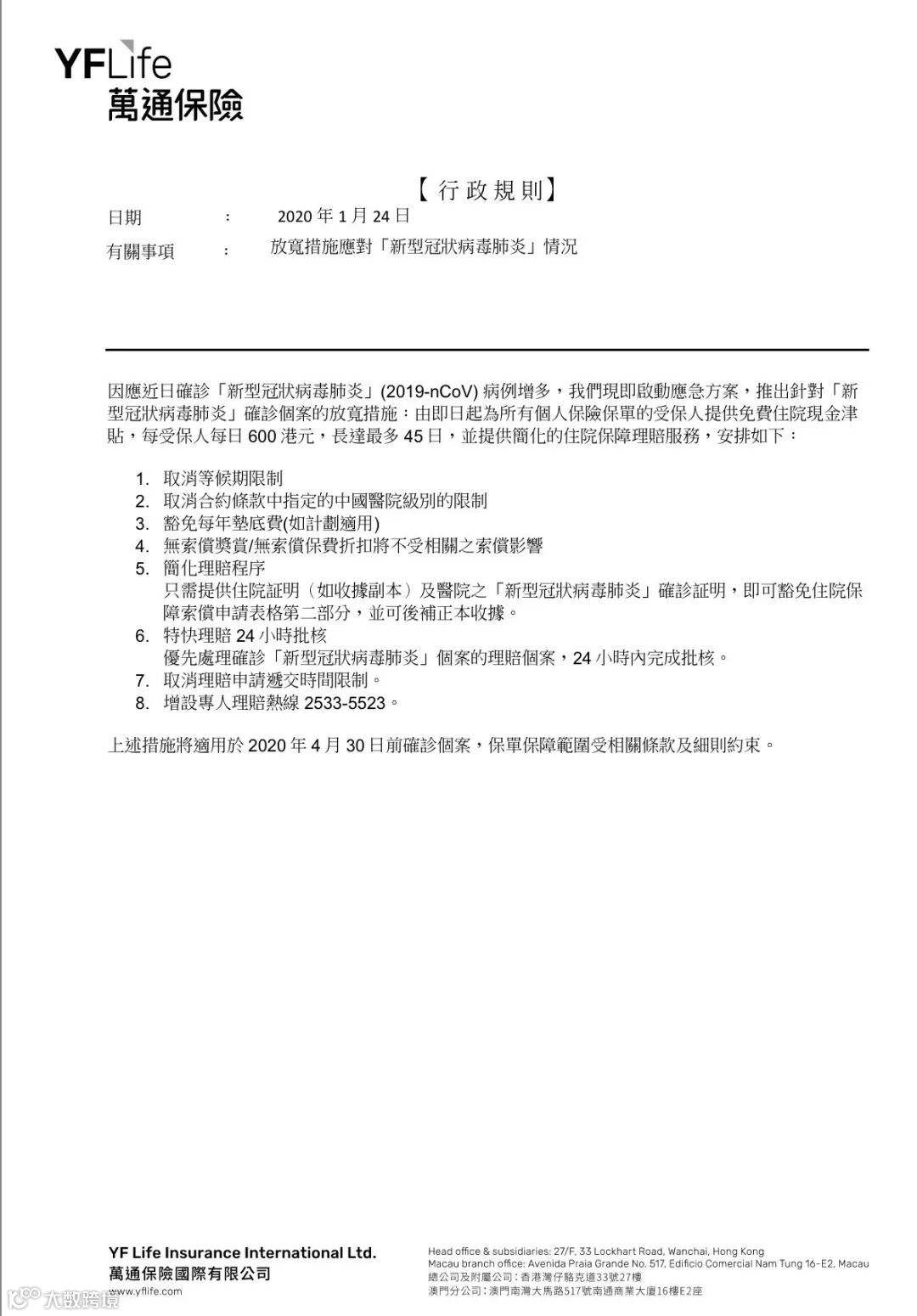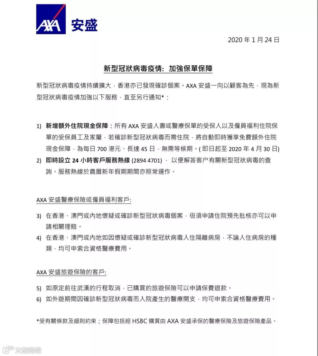 1月29日,友邦香港再次升级针对新型冠状病毒的支援服务,免费给予所有友邦个人(人寿,医疗,重疾,意外等)及团体客户额外1年免费“新型冠状病毒诊断赔偿”,也就是一旦确诊将获得友邦15000HKD赔付。