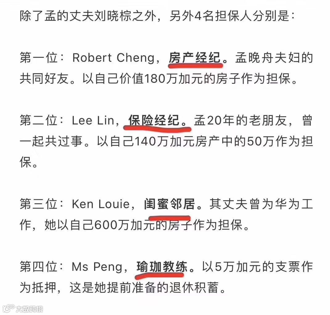 举世瞩目的孟晚舟案,靠谱的保险经纪承担着重要角色,孟晚舟的辩护律师透露担保人的名单,分别是:孟晚舟的房产经理、保险经纪人、好友邻居以及一位瑜伽教练。
