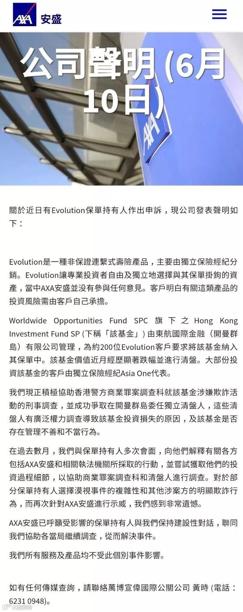 香港安盛有一款105投连险产品叫Evolution,背后有上千支基金可以作为投资标的让投资者进行选择。其中有一支基金,叫“Hong Kong Investment Fund SP”(香港投资基金,简称HKIF),出现了严重“违约”,致使投资了这支基金客户的账户价值一夜暴跌95%。据称,200多名投资者的总损失高达4亿港币。