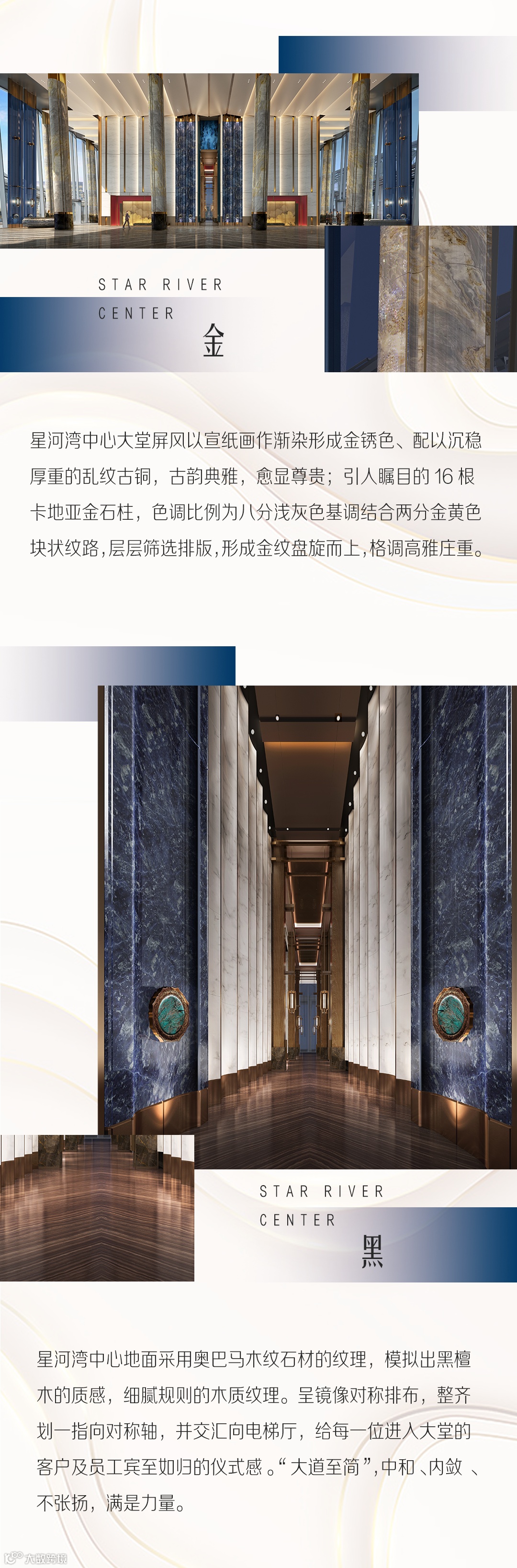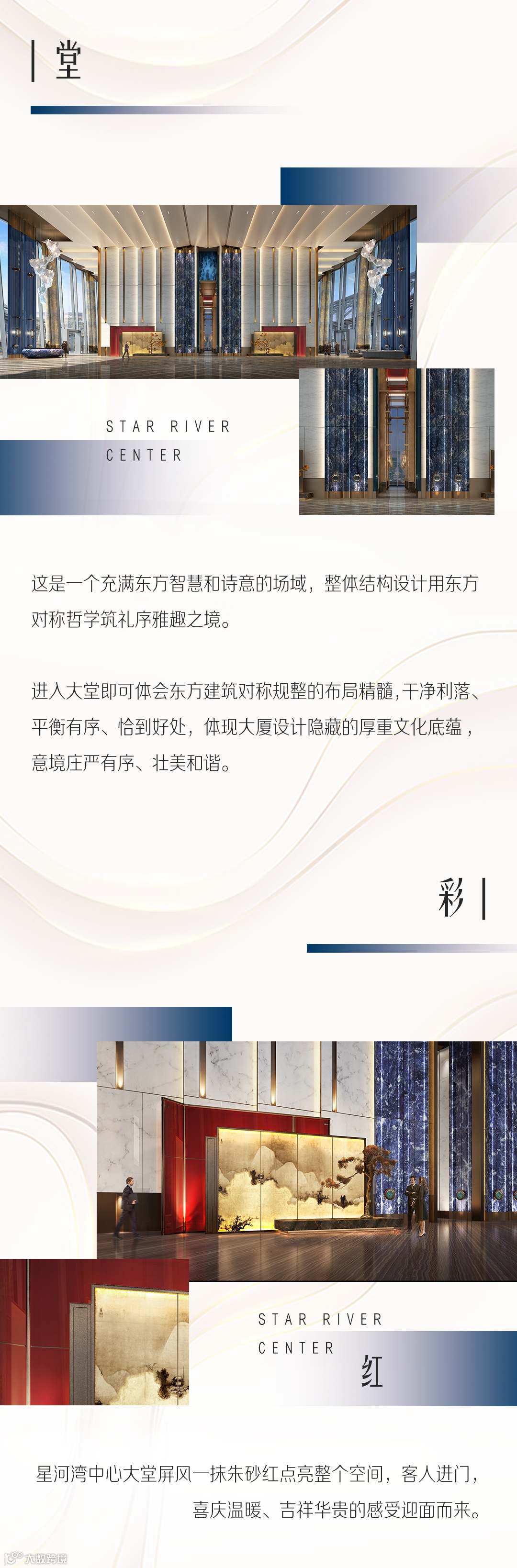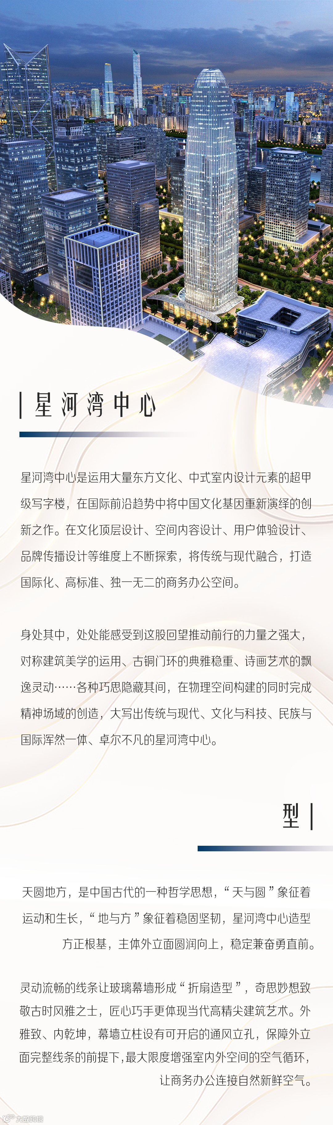 星河湾中心,位于大湾区新经济发展引擎——广州琶洲互联网创新集聚区,是星河湾集团集20多年城市建设、城市大服务及智慧应用经验之大成,以“舍得、用心、创新”价值观打造的首座超甲级写字楼,以东方美学与智慧科技为媒,诠释智能商务新场景。