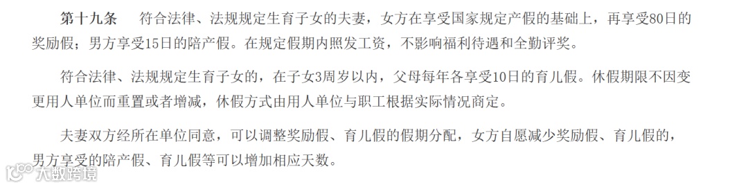 ➤符合法律、法规规定生育子女的夫妻,女方在享受国家规定产假的基础上,再享受80日的奖励假;男方享受15日的陪产假。在规定假期内照发工资,不影响福利待遇和全勤评奖。