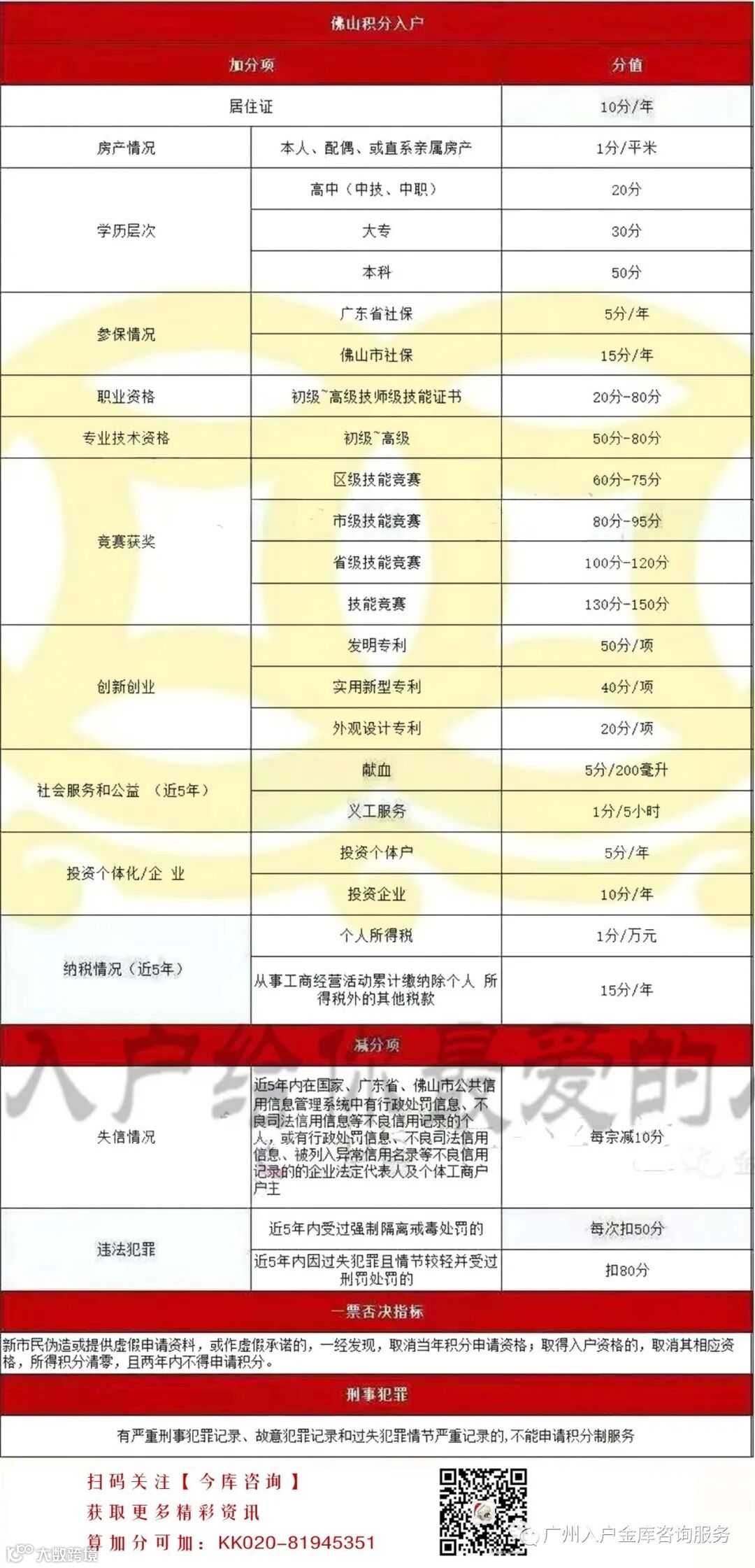 如果还不知道自己多少分,或者不知道怎么算分的,都可以加微信:KK020-81945351来一对一咨询哦,附上佛山积分入户的算分表。