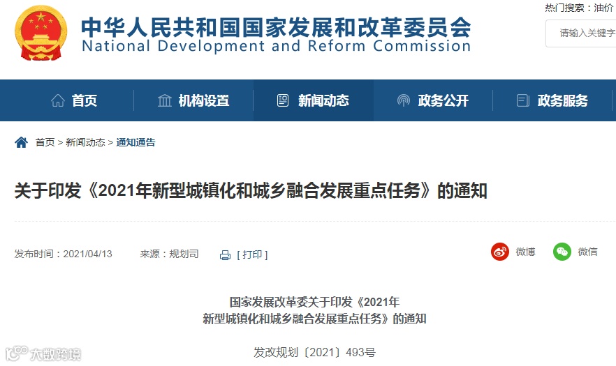 国家发展改革委关于印发《2021年新型城镇化和城乡融合发展重点任务》的通知