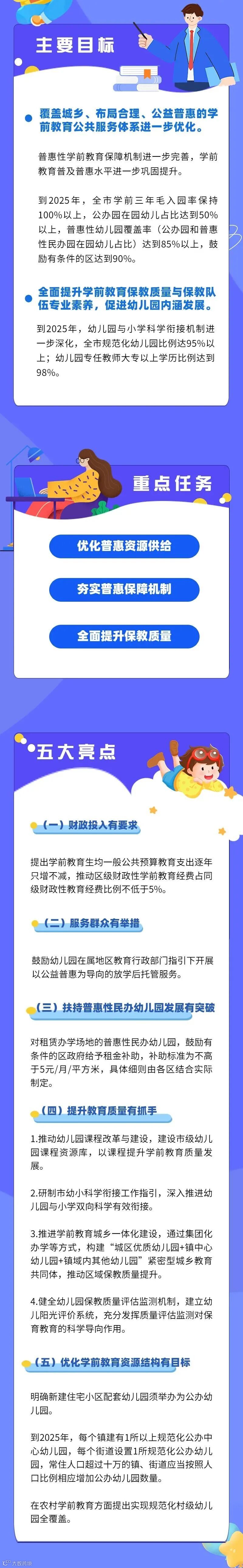 《行动计划》明确我市“十四五”期间学前教育发展的指导思想、主要目标和重点任务。从优化学前教育资源结构布局、完善学前教育保障机制、建立专业稳定的保教队伍、全面提升学前教育质量、优化幼儿园监管长效机制等五个方面提出十八条举措。