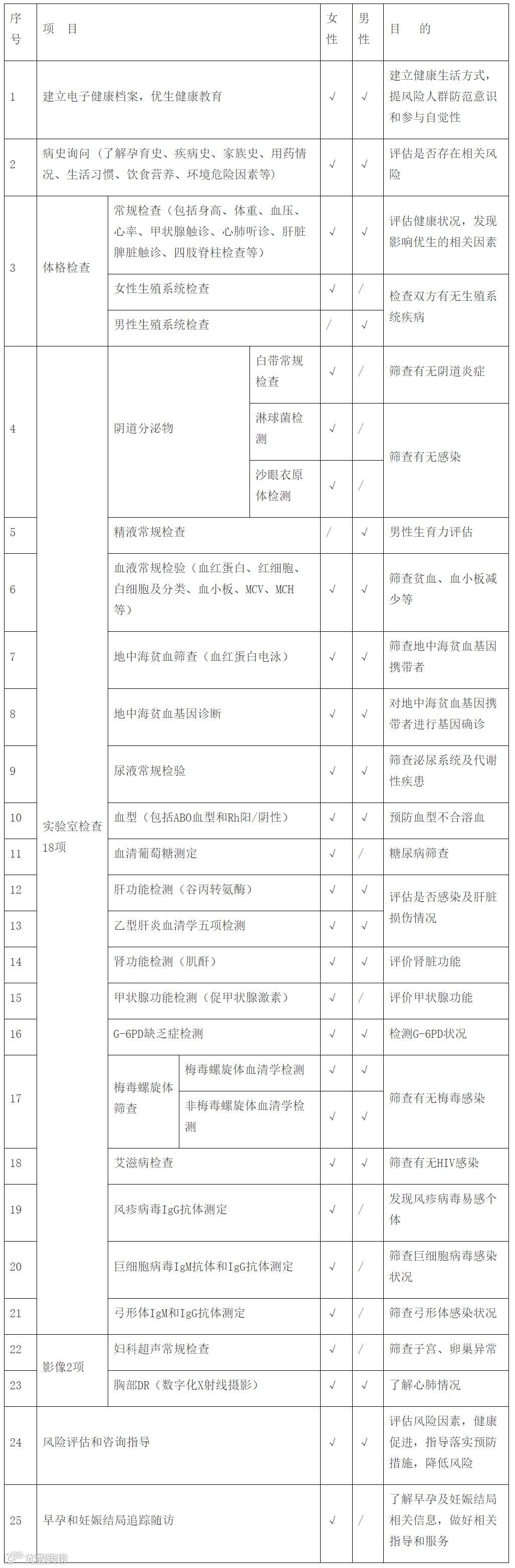 免费婚前孕前健康检查包括优生健康教育、体格检查、精液常规检查、风疹病毒IgG抗体测定、地中海贫血检测、妇科超声等25项(如下图所示)。重复检查或超出所列免费服务内容的其他检查,费用由个人自付。