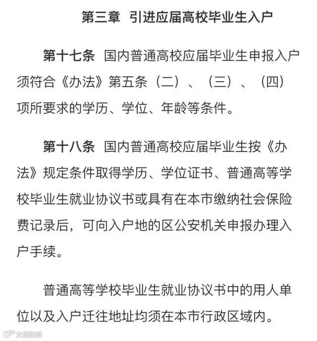 第十八条 国内普通高校应届毕业生按《办法》规定条件取得学历、学位证书、普通高等学校毕业生就业协议书或具有在本市缴纳社会保险费记录后,可向入户地的区公安机关申报办理入户手续。