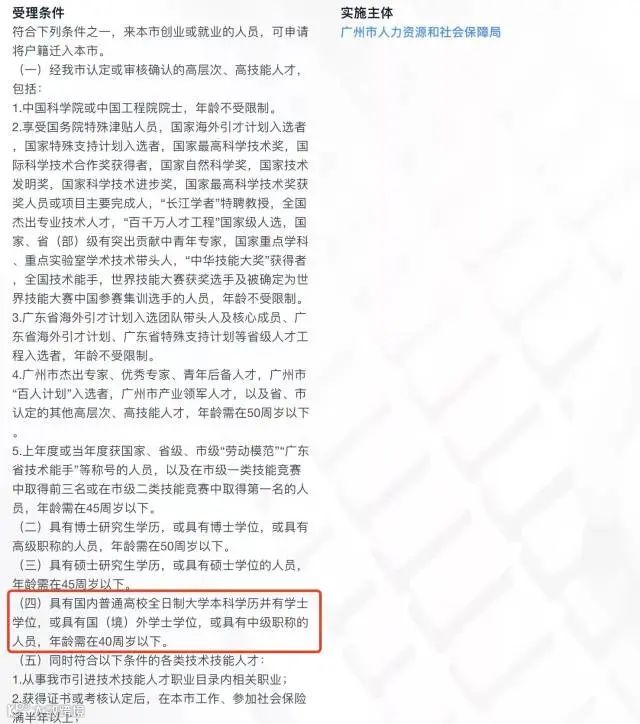 目前,根据广州市人力资源和社会保障局官网“引进在职人才入户”受理页面显示,来广州市创业或就业人员,符合“具有全日制本科学历、有学士学位证的,或具有中级职称的,年龄在40周岁以下”即可申请将户口迁入。