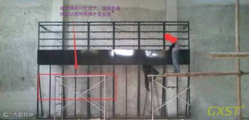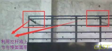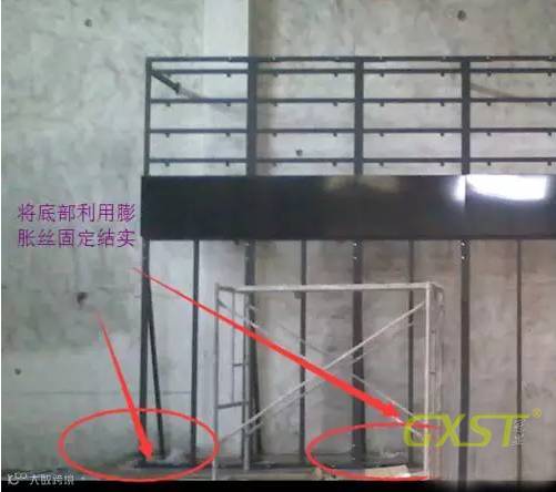 3、之后,将支架组装成整体,使用电锤和螺丝将底部固定好,然后使用拉杆将支架和后墙连接固定。