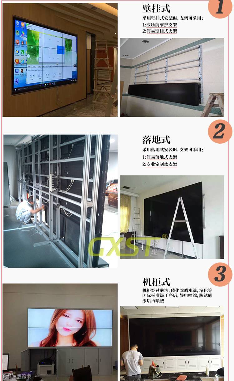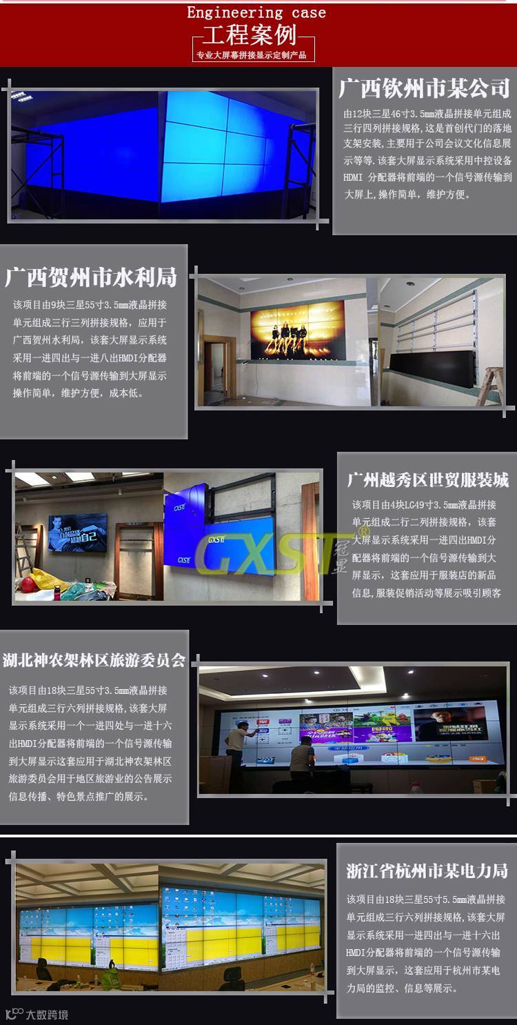 5、拼接屏安装拼接:拆封后,将大屏挂到支架上,调整第一排整体等水平位置为一个平面,将屏与屏之间等缝隙调节到最佳宽度;