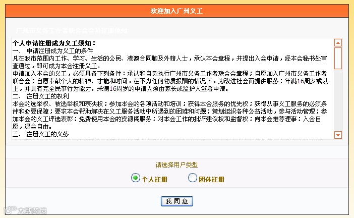 第3步:进入“欢迎加入广州义工”页面,认真阅读须知后,“请选择用户类型”点击“个人注册”(系统暂不接受团体注册,如需注册单位会员请拨打电话020- 86479019咨询),点击“我同意”。