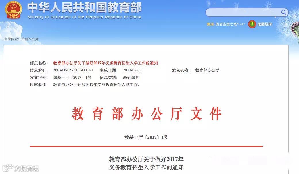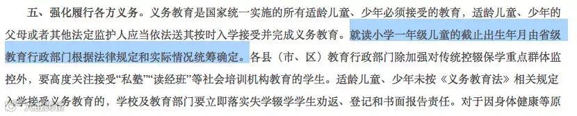 它来自教育部办公厅印发的《关于做好2017年义务教育招生入学工作的通知》,明确提到:就读小学一年级儿童的截止出生年月由省级教育行政部门根据法律规定和实际情况统筹确定。