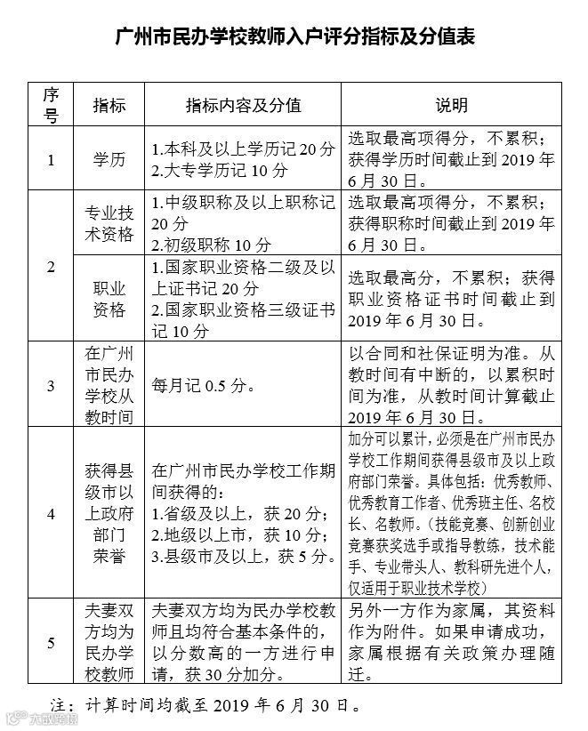 (一)建立广州市民办学校教师入户评分指标体系,对申请入户的民办学校教师的条件进行指标量化,并对每项指标赋予一定分值(详见附件)。申请人只需符合申请入户的准入基本条件即可提出入户申请。根据申请人评分排序情况,按程序获得入户指标后,准予办理入户手续。