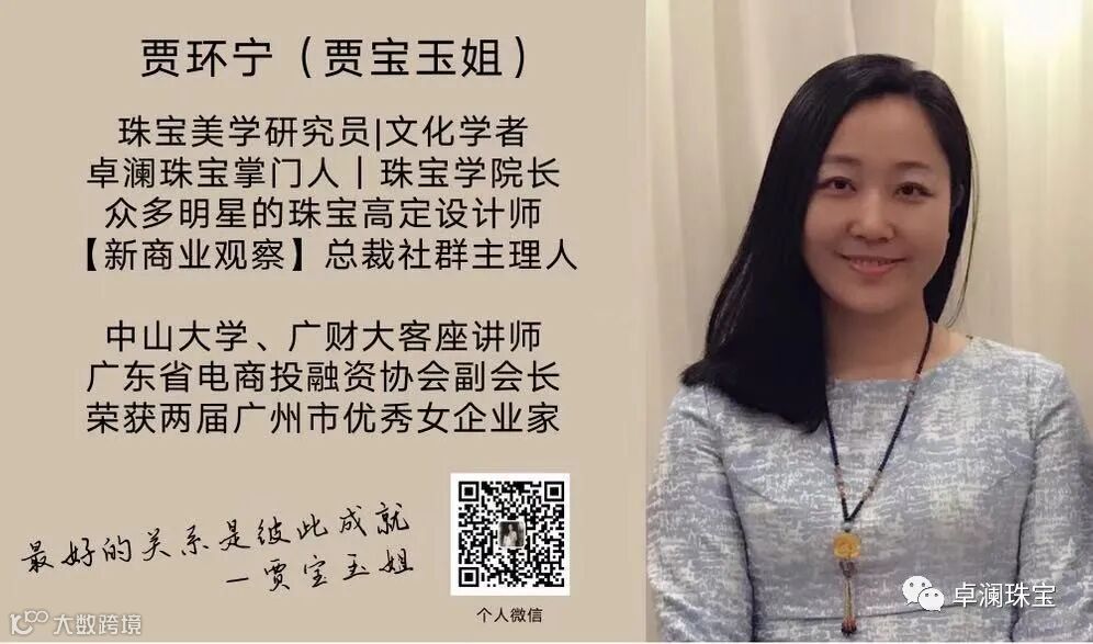 “Hi,我是贾环宁,大家都叫我“贾宝玉姐”。让我自嗨的一个身份是担任卓澜珠宝首席设计师,我也是16年珠宝圈儿的老司机了,深耕珠宝首饰源头供应链多年,很荣幸设计的珠宝曾被凤凰卫视吴小莉,演员黄圣依、陶虹、斯琴高娃、郭靖黄日华、孙楠等老师所收藏。今年是我海归创业的第7个年头,我也是个喜欢深度思考,不断升维商业认知的俩娃妈️。”