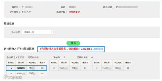 例如A学校有20个学位,某学生填报了A学校为志愿学校,页面就会显示四行数据:你在A校的排名、报名号、姓名、全区积分排名,达到A校前20名的,可以录取到A校,如果排在A校20名之后的,不予录取。校排名随报名情况实时更新。