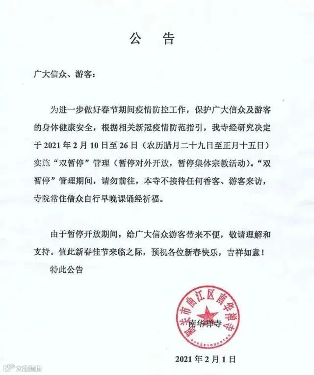 “双暂停”管理期间,请勿前往,南华禅寺不接待任何香客、游客来访,寺院常住僧众自行早晚课诵经。